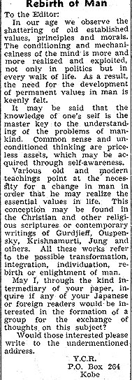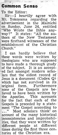 Hij reageert op een advertentie van een bijbelgenootschap in de Mainichi Shimbun waarin beweert wordt dat de evangeliën door de apostelen geschreven zijn. Later bezoekt hij de missionarissen, die de advertentie geplaatst hebben thuis. Het debat met die 'herboren' Christenen blijkt al bij voorbaat een verloren zaak.