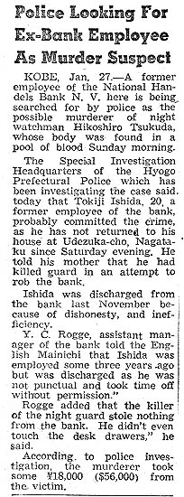 Het nieuwe jaar begint al met een onheilspellend voorval. IJsbrand wordt op een zondagmorgen eind januari 1958 gewekt door senior clerk Waimatsu. Er heeft zich een gruwelijk voorval afgespeeld op kantoor. Als een office-boy 's morgens het kantoor opent treft hij daar de nachtwaker in een poel van bloed aan. De moordbrigade van de politie komt dadelijk in actie. Na een speurtocht van een paar dagen wordt vastgesteld dat een ontslagen office-boy de schuldige is. Hij was 's avonds bij de nachtwaker aangekomen om wat geld te vragen. Toen deze hem dat weigerde werd hij kwaad en ging hem met een mes te lijf, met dodelijke afloop. De jongen werd op Kyushu opgespoord waar hij met zijn meisje de bloemetjes aan het buitenzetten was van het geld dat hij gestolen had. Op kantoor leek de jongen een aardig kereltje, maar werd ontslagen omdat hij de kantjes er af liep.