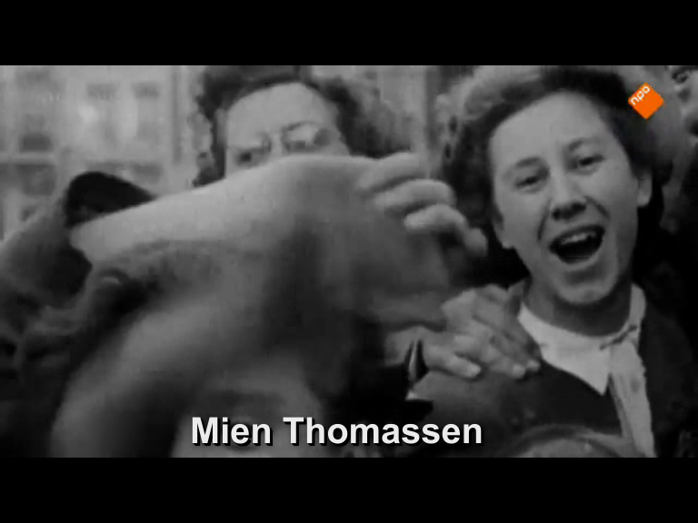 Ook Deventer wordt bevrijd. Mien Thomassen bevindt zich uitgelaten onder de verwelkomende bevolking.